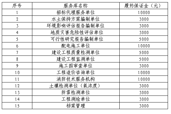 南平綠發集團有限公司因經營需要,擬成立服務庫,現實施2023年服務庫招錄,本次招錄合作期三年,要求如下: 一、本次招錄類別及資格條件 本次共招錄15個類別服務庫,綠發集團及下屬公司在今后的工作中,在不違反有關法律、法規規定的前提下,結合集團服務庫管理辦法,從服務庫中選擇具體的服務單位。滿足資格的南平市市屬國企單位可直接入庫,入庫的南平市市屬國企單位家數包含在對應服務庫家數內。若入圍家數少于3家不能形成有效竟爭的,集團公司將從庫外另行再邀請相應服務單位參與比選。本次具體類別及資格條件要求如下: 1. 招標代理服務單位(10家) 具備提供工程招標代理服務的企業法人單位。且根據《閩建筑函[2018]26號》的規定投錄人應當取得公司法人《營業執照》(登記營業范圍須包含工程招標代理業務)且完成并通過福建省住房和城鄉建設政務服務系統登記企業基本信息。(提供營業執照復印件加蓋公章、福建省住房和城鄉建設政務服務系統登記證明材料加蓋公章) 2. 水土保持方案編制單位(5家) 具備建設項目水土保持方案編制水平評價證書 1星及以上資質。(提供營業執照和資質證書復印件加蓋公章) 3. 環境影響評估報告編制單位(5家) 具備環境影響評估報告編制能力,且在環境影響評價信用平臺登記的單位。同時不得被列入《建設項目環境影響報告書(表)編制監督管理辦法》規定的限期整改名單、環境影響評價失信“黑名單”。(提供環境影響評價信用平臺登記證明材料加蓋公章、未被列入限期整改名單和環境影響評價失信“黑名單的證明材料) 4. 地質災害危險性評估單位(5家) 具備自然資源主管部門頒發的乙級及以上地質災害危險性評估單位資質。(提供營業執照和資質證書復印件加蓋公章) 5. 可行性研究報告編制單位(6家) 具備可行性研究報告編制能力,且應是通過全國投資項目在線審批監管平臺備案的工程咨詢單位(建筑工程、市政公用工程)專業。(提供通過全國投資項目在線審批監管平臺備案相關信息截圖、營業執照復印件、資質證書復印件加蓋公章) 6. 配電施工單位(5家) 具備建設行政主管部門頒發的電力工程施工總承包或送變電工程專業承包三級及以上資質,并已通過南平電業局入網審查。(提供資質證書復印件、通過南平電業局入網審查證明材料加蓋公章) 7. 建設工程質量檢測單位(6家) 具備建設行政主管部門頒發的建設工程質量檢測資質。(提供營業執照復印件和資質證書復印件加蓋公章) 8. 建設工程監測單位(6家) 具備建設行政主管部門核發的合格有效的工程勘察專業類(巖土工程物探測試檢測監測)乙級及以上資質或工程勘察綜合甲級資質。(提供營業執照復印件和資質證書復印件加蓋公章) 9. 施工圖審查單位(5家) 具備建設行政主管部門頒發的二類及以上施工圖審查資質證書。(提供營業執照復印件和資質證書復印件加蓋公章) 10.工程造價咨詢單位(6家) 具備提供工程造價咨詢服務的企業法人單位。且根據《閩建筑函[2021]60號》的規定投錄人應當取得具有工程造價咨詢經營范圍的營業執照且完成并通過福建省住房和城鄉建設政務服務系統登記企業基本信息。(提供營業執照復印件、福建省住房和城鄉建設政務服務系統截圖加蓋公章) 11.消防技術服務機構(6家) 符合《應急管理部關于印發〈消防技術服務機構從業條件〉的通知》的消防技術服務機構(建筑消防設施維護保養檢測)。(提供營業執照復印件、福建省消防技術服務信息平臺的截圖證明等相關證明材料加蓋公章) 12.土壤檢測單位(氡濃度)(5家) 具備市場監督管理部門頒發的具有CMA標志的資質認定證書。(提供營業執照復印件和資質證書復印件加蓋公章) 13.防雷檢測單位(6家) 具備氣象主管機構頒發的雷電防護裝置檢測資質。(提供營業執照復印件和資質證書復印件加蓋公章) 14.工程測繪單位(6家) 具備行業主管部門頒發的工程測繪資質。(提供營業執照復印件和資質證書復印件加蓋公章) 15.檔案管理(5家) 具備行業主管部門頒發的福建省檔案服務機構備案證明(提供營業執照復印件、福建省檔案服務機構備案證明材料加蓋公章) 二、招錄須知: 1. 招錄報名時間:2023年07月17日至2023年07月21日止,逾期不予受理。 2. 招錄報名:有意向的單位于報名時間將以下資料發至郵箱864794732@qq.com ,否則招錄人有權拒絕其報名。 (1)法定代表人身份證明、法定代表人身份復印件加蓋單位公章或其授權委托書、被授權人的身份證復印件(加蓋單位公章); (2)營業執照(加蓋單位公章); (3)附件一(報名函); (4)投錄保證金轉賬憑證加蓋公章。 單位負責人為同一人或者存在控股、管理關系的不同單位,不得參加同一類別的同一庫項目投錄。 3. 投錄文件遞交方式及遞交時間: 遞交時間:2023年7月24日,上午8:30-11:30,下午15:15-17:30。 遞交地址:福建暉源工程咨詢有限公司開標室(福建省南平市建陽區童游大街36-10號高速監理公司辦事處對面國家電網旁二樓) 逾期送達或不符合本招錄文件要求的文件將被拒絕。 4.開錄時間:2023年7月26日上午8:30。 5. 投錄保證金: 5.1投錄保證金提交金額:每一個服務庫人民幣叁萬元整 (¥30000 元),投錄保證金必須從企業賬戶一次性匯出(以到賬時間為準,匯出賬戶名稱與企業名稱應一致),否則招錄人有權拒絕接收投錄人的投錄文件。 參加本次招錄的南平市市屬國