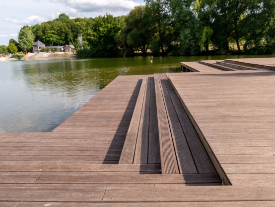 莊禾公司研發的新型環保戶外竹地板,鋪設在法國巴黎法蘭西島大區的第三大公園喬治-瓦邦公園內的水邊棧道。