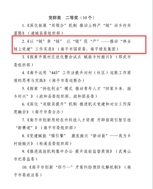 近期,由市直機關(guān)工委、市委組織部、市委改革辦、市發(fā)改委、市效能辦聯(lián)合組織開展的“第三屆全市機關(guān)體制機制創(chuàng)新優(yōu)秀案例征集評選活動”公布了獲獎情況。綠發(fā)集團報送的《以“鏈”串“鏈” 以“鏈”促“產(chǎn)”——推動“林業(yè)鏈上黨建”工作實錄》案例,榮獲黨群類二等獎。